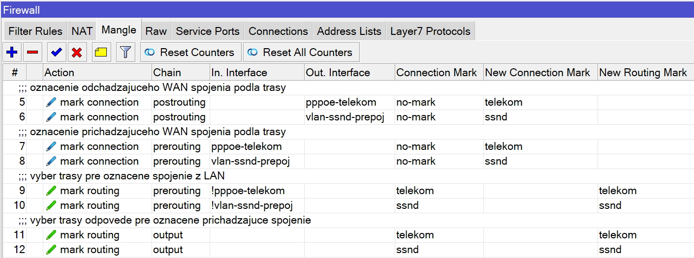 Pozor si treba dať na situáciu, keď máme verejnú IP adresu u viacerých ISP a cez ňu prijímame spojenia. Za normálnych okolností trasa odchádzajúcich paketov nezohľadňuje, cez ktoré pripojenie bolo nadviazané spojenie. Je jasné, že pokiaľ prichádza spojenie cez ISP2 a my odpovieme cez predvoleného ISP1, spojenie sa nenadviaže. Pre riešenie tejto situácie je potrebné označovať prichádzajúce spojenia (Firewall Mangle: mark-connection) a potom na základe označeného spojenia meniť tabuľku smerovania (mark-routing). Toto je však nad rámec nášho kurzu.