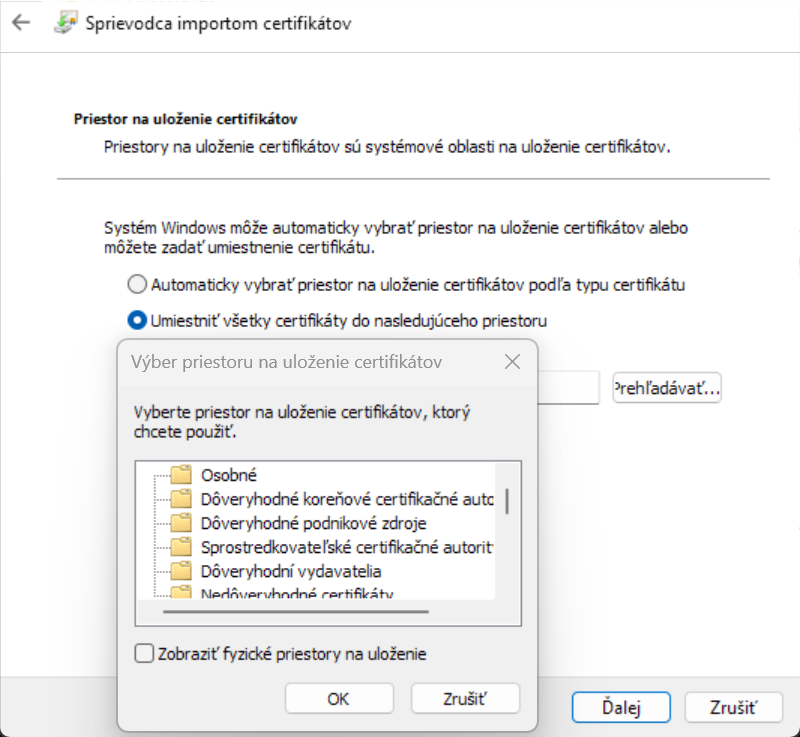 Pokiaľ ako klienta pripájame priamo koncové zariadenie s OS Windows, je potrebné vyššie uvedený certifikát „inštalovať“, pričom ukladacím priestorom musí byť „Lokálny počítač“ a „Priestor na uloženie certifikátu“ musíme zvoliť ručne voľbou „Dôveryhodné koreňové certifikačné autority“.